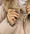 Damen Winterjacke Beige – Steppjacke mit Kapuze und Fellbesatz
