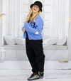 Blaue Oversize Strickjacke Damen mit Blumen und „Smile Everyday“ Schriftzug | S - 2XL