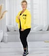 Gelbe Oversize Strickjacke Damen mit Blumen und „Smile Everyday“ Schriftzug | S - 2XL