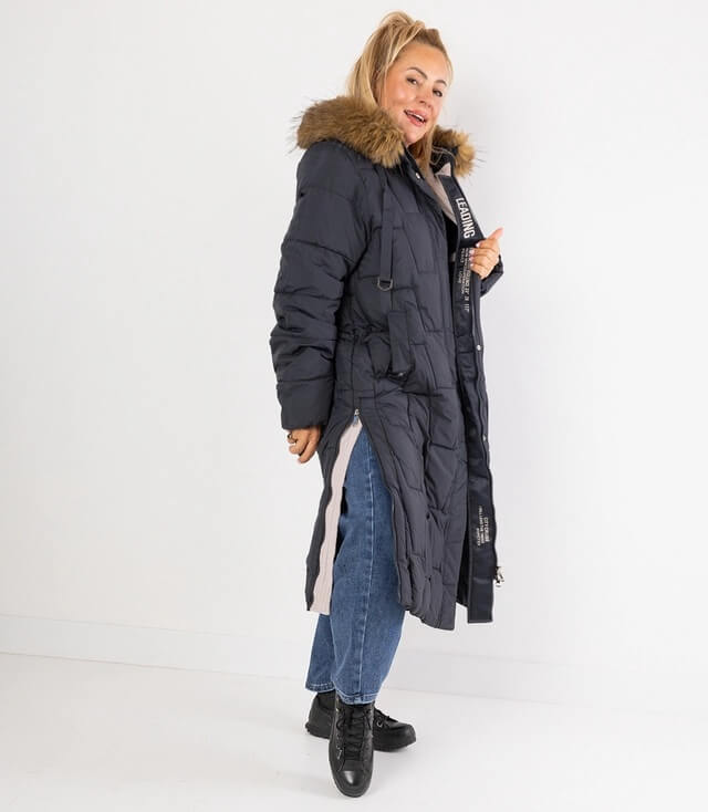Steppmantel Damen lang Marineblau – Warmer Wintermantel mit Kunstfellkapuze